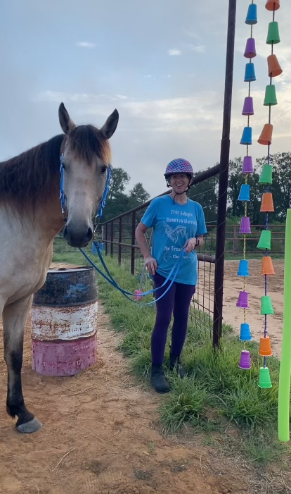 We stood there breathing and watching the curtain sway in the breeze. Eventually, I asked for a step forward. He extended his front leg, rubbed his nose against it. I told him good boy enthusiastically. He left the foot extended when he put his head up. More breathing, standing, and watching. I asked for another step. He shuffled his feet and I told him good boy again, would you like to walk away? He said yes please, so we walked to the left corner, circled around a barrel, then came back in front of the curtain. This time when I asked for a step forward, he took an actual step. I praised him enthusiastically. He got a little scared and took a step back, and I stepped back with him. We spent more time just standing and breathing. Occasionally I would give him a cookie, just for standing there. I asked him if he wanted to walk away again, and he said yes, so we walked to the right, circled a barrel, and came back.
