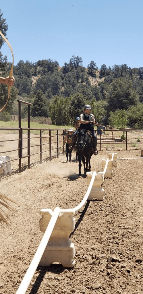 I look back on that & shake my head – at the time I weighed 314 lbs, had not ridden regularly since I was 14, and could barely hit the broad side of a barn with an arrow. Now I weigh less than I ever have in my adult life, I own two horses, both of whom have had arrows shot off of them, and I can at least hit the side of a large stationary object with a bow & arrow, and yet….I’m really not making any progress with mounted archery. I bowed out of the group classes because they were making me a miserable ball of anxiety. I haven’t practiced with either horse in forever.