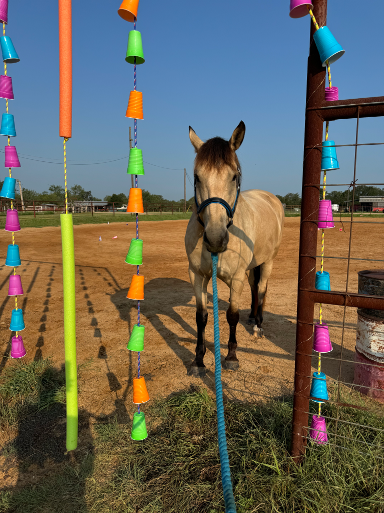 So Griffy was trained that way, and that’s what I tried to do as well. I’m gonna say this, though – I suck at it. I just don’t have very good timing, and that’s really important. We stumbled through it – I mean I got him to do mounted archery, so it’s not all bad, but I feel like that’s more despite my methods rather than because of them. The problem I always had is that he gets SO INTO the treats. He becomes so focused on getting them he is no longer trying to do the thing, he’s just trying to get a treat. R+ training says you need to lower the “value” of the reward – so instead of offering their favorite cookie, you give them a bit of alfalfa, or some forage, or something less exciting. The problem with Griffy is that everything is high value to him. Either it’s so boring he doesn’t want it (like plain hay) or he wants it with a fiery passion. We worked with a professional R+ trainer once and she said we just had to keep the sessions limited, before he got too excited. But he ramps up really fast – you get maybe 1-2 minutes. I know training sessions should be short, but it doesn’t feel like a lot is getting done in 90 seconds. I have also heard of pause buckets, where you direct them to forage to take a break, but that didn’t really work either, because he’s so amped up about the treats he ignores the forage and just follows me nickering…with a giant erection.