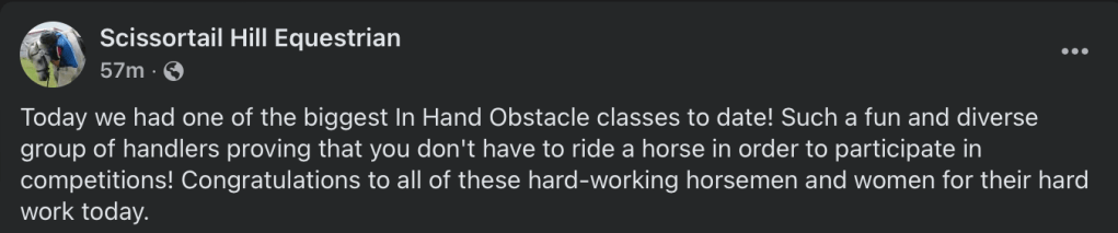 Today was the first obstacle trail show of 2025. C. was judging, but this time instead of helping her, M. and I were competitors. She told us to get to the barn at 6:45am, so I rolled up at 7:03 which is right on time for horse people. Griffy and Levi had baths the day before, were conditioned and sheened, and ready to go.