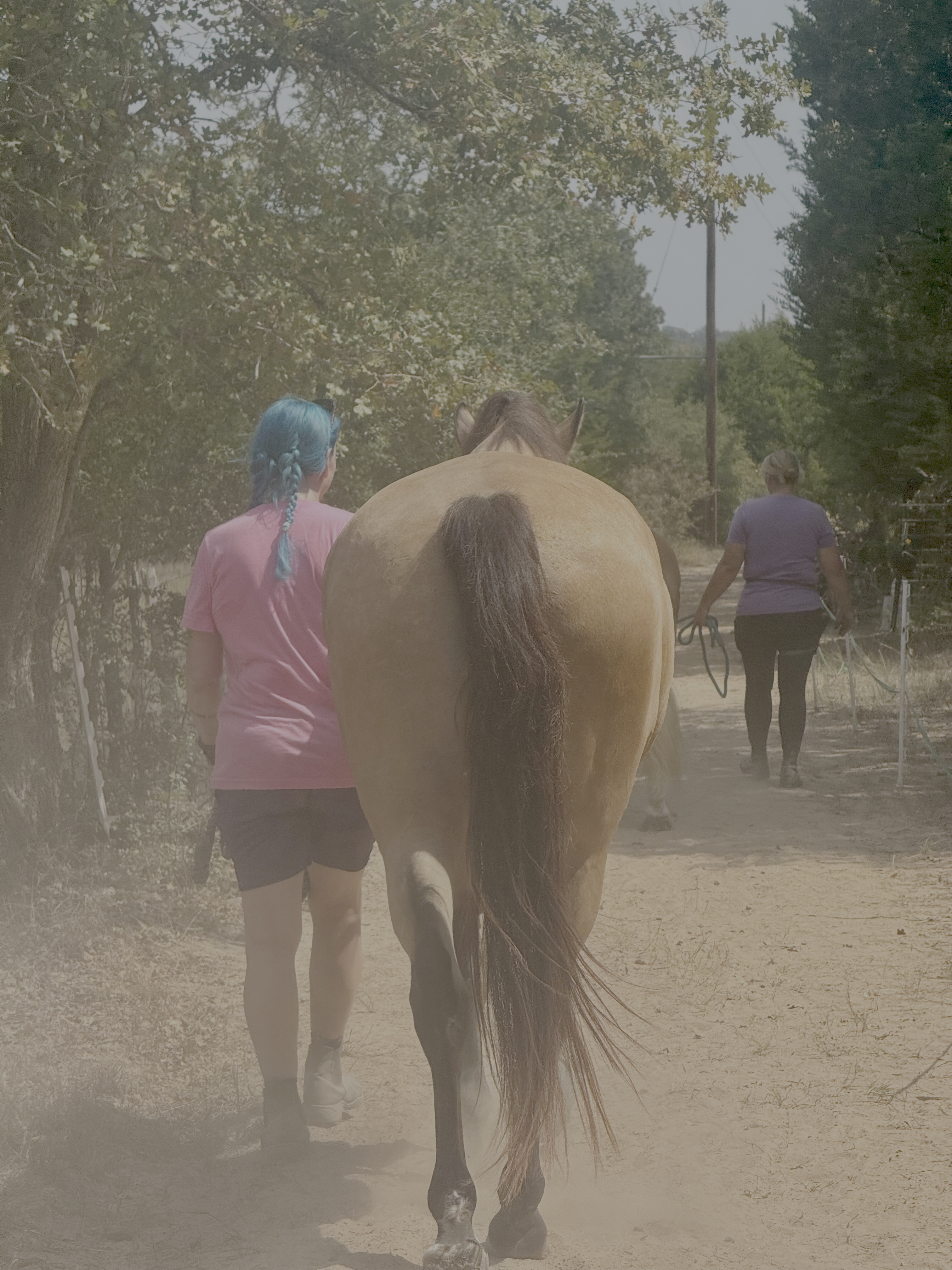 Talos still has a lot of anxiety at the new place. He’s good in his pasture, the grooming area, and the round pen, but the rest of it is still pretty scary. He does really well in a group, and we have to start somewhere, so today we led him down the lane along with two other mares – Filene and Webb. This was a little tough for him because neither was particularly interested in his friendly overtures, but he soon learned to keep his distance.