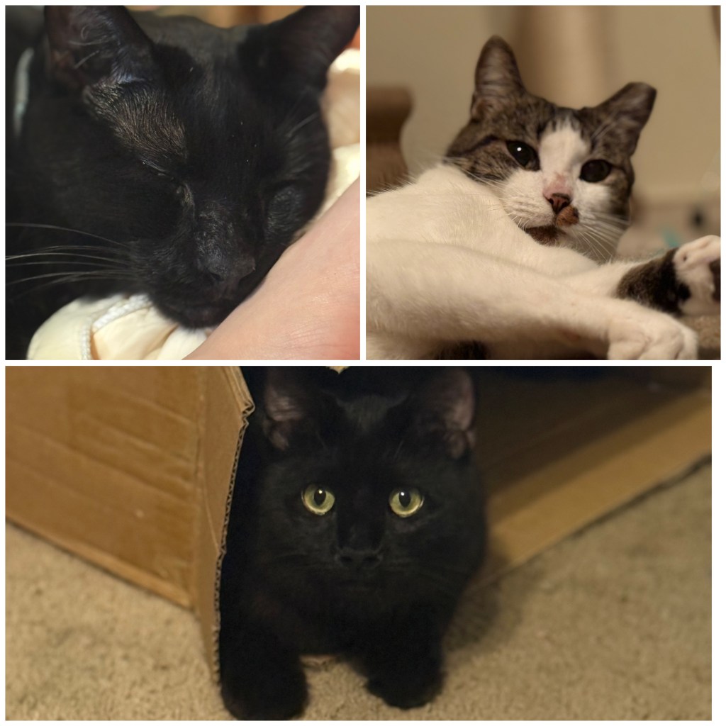 I got Nick Valentine in 2017 – I sort of, half thought maybe I wanted a kitten, and I stopped by Petco to get dog food and surprise, they were having a cat adoption event. I’d always wanted a black cat…in what I’m sure was a brilliant manipulation technique, the volunteer let me hold him and said “Now be careful, he doesn’t like to be held and will try to get away.” Instead he sat perfectly still in my arms and it was love at first snuggle. Now he’s my best co-worker, snuggle buddy, couch surfer, and destroyer of couches.